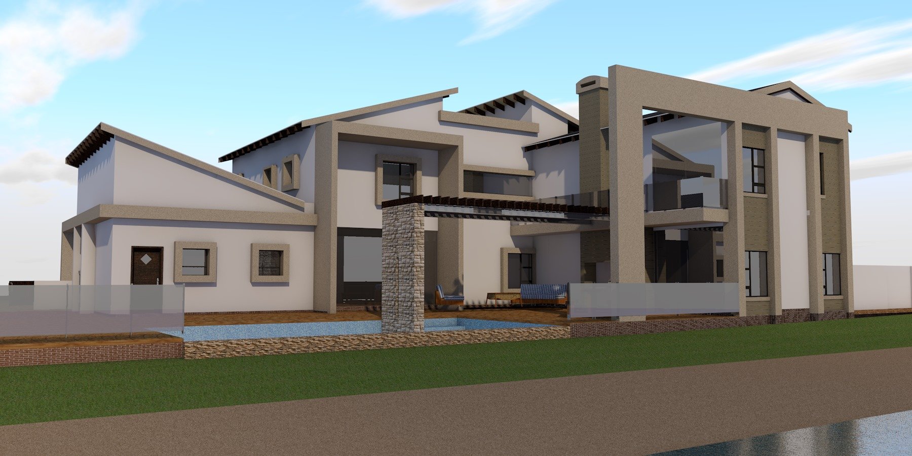 New modern style house designed with an open plan stile leading onto a infinity pool overlooking the lake